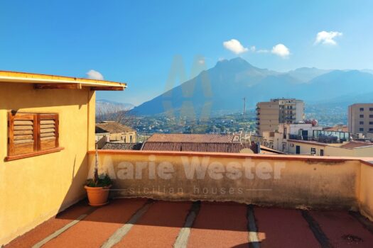 Walking down the historic Via Roma staircase in one of Termini Imerese’s most picturesque locations is this spacious antique apartment with a patio and sea view terrace.